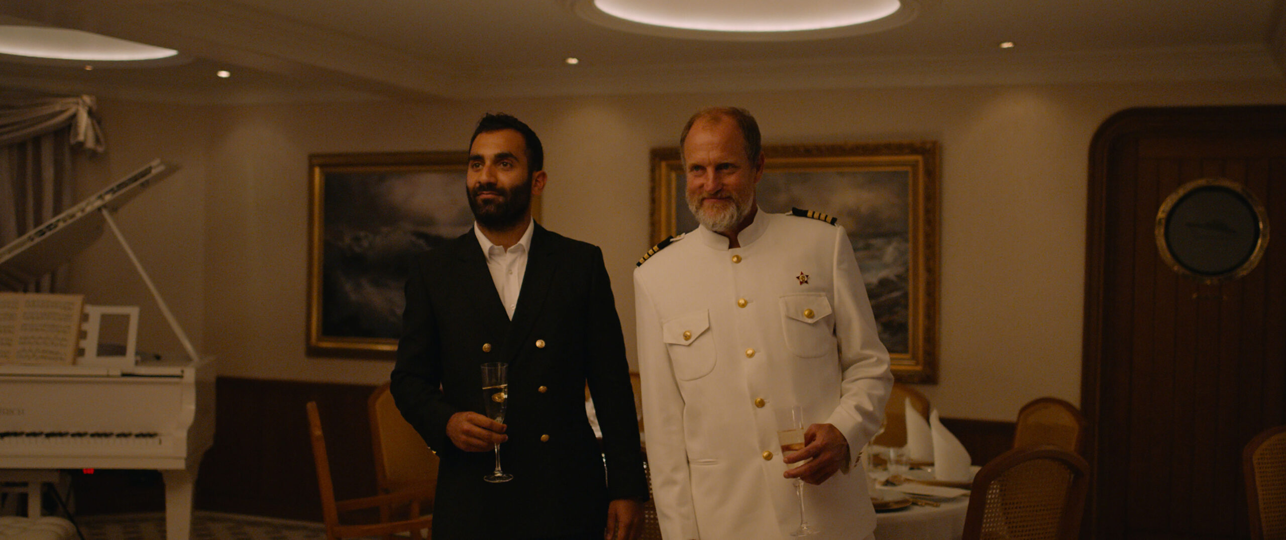 Nun aber von vorn: Triangle of Sadness ist kein klassisch aufgebauter Film, denn wir sehen hierbei drei Akte. Der erste führt uns zu den beiden vermeintlichen Hauptcharakteren des Films, Carl (Harris Dickinson) und Yaya (Charlbi Dean). Sie beide sind als Models in der Modebranche tätig und verdienen durch ihr Äußeres Geld. Aber, und das macht Östlund hier deutlich, die Verhältnisse des Verdienstes sind in dieser Branche umgekehrt. Yaya ist finanziell besser aufgestellt und das bleibt auch aufgrund vorherrscher geschlechtlicher Rollenbilder nicht konfliktfrei. Etwa wenn es um das Zahlen des Abendessens geht, das in einen handfesten Streit um Geschlechterrollen und Erwartungen mündet. Im zweiten Akt finden wir die Beiden auf einer Yacht wieder, auf der sie dank dem Influencerinnen-Dasein von Yaya kostenlos ein Zimmer ergattern konnten. Dort treffen sie auf allerlei skurrile, schrullige und ernste Charaktere, die aber eines gemeinsam haben: Sie sind steinreich und können sich eine solche Reise nur zu gut leisten. Und natürlich alle möglichen Extras, die sie nur wollen. Darauf spielt sich auch schon die Crew ein, angeleitet von Chefin Paula. Ziel sei es, keinen Wunsch abzuschlagen, nichts abzulehnen. Untergebenheit in Reinkultur. Und derlei schräge Wünsche finden sich häufig.
